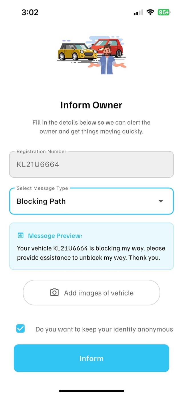 The owner is notified to clear the way, and you’re back on track. No more honking, waiting, or wasted time in parking chaos.